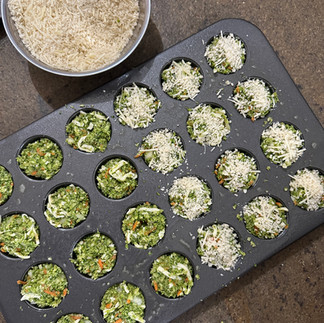Prepare mini baking tin with non stick spray, scoop broccoli mixture in each cup